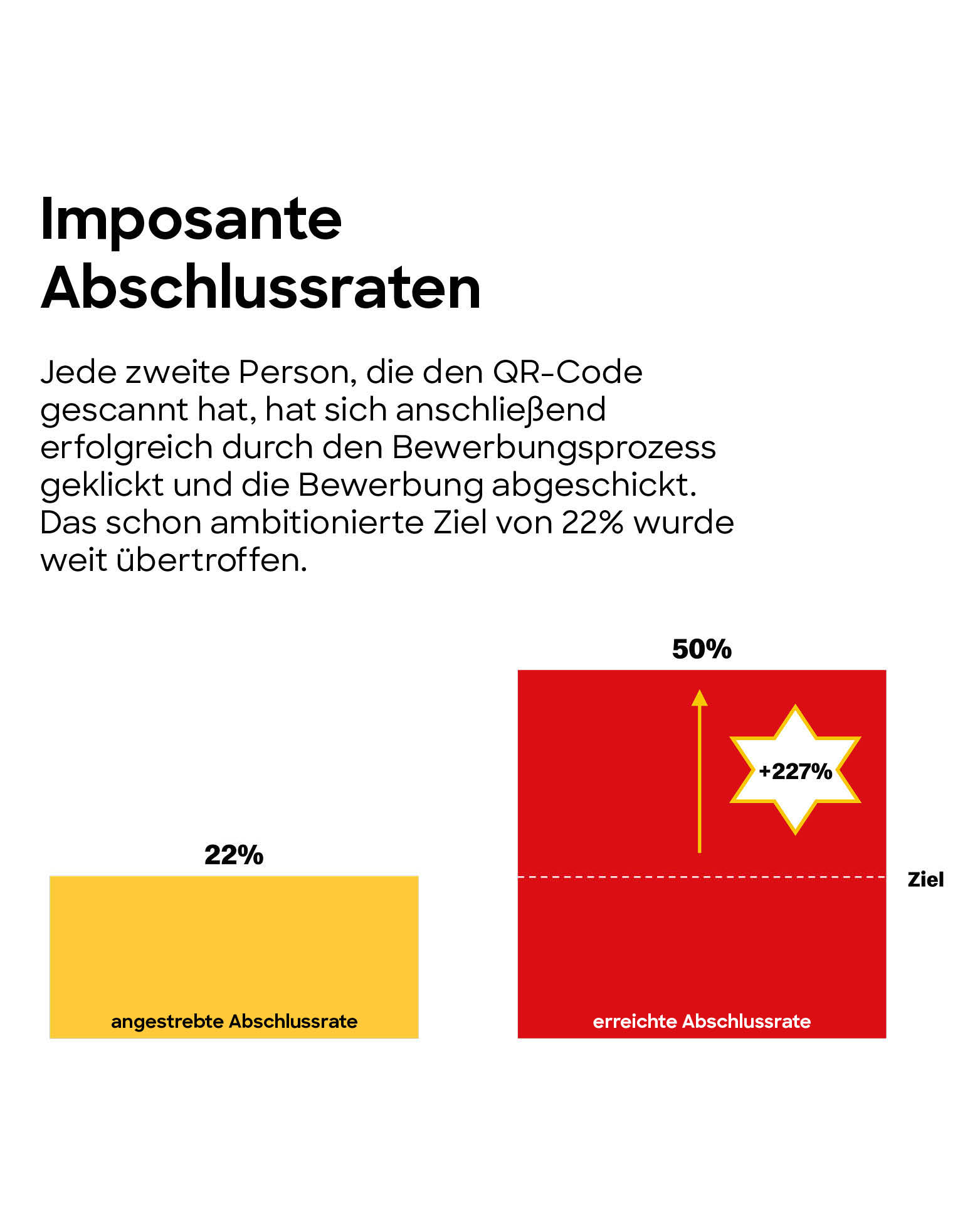 Die Fachkräftekrise ist auch bei McDonald's deutlich spürbar - der Personalmangel ist ein echtes Geschäftsproblem. Um neue Mitarbeiterinnen und Mitarbeiter zu gewinnen, wird eine neue Zielgruppe angesprochen: Die vielen Menschen, die jedes Jahr die Schule ohne Abschluss verlassen, kaum Chancen auf dem Arbeitsmarkt haben und oft an komplizierten Bewerbungsprozeduren scheitern. Anlass genug für die Einführung des sehr einfachen Bewerbungsverfahrens "Mit einem Scan zum Job." Einfach per QR-Code die Stellenangebote in der Nähe scannen, ein paar Felder ausfüllen, fertig! Denn jede*r verdient eine Chance auf dem Arbeitsmarkt.